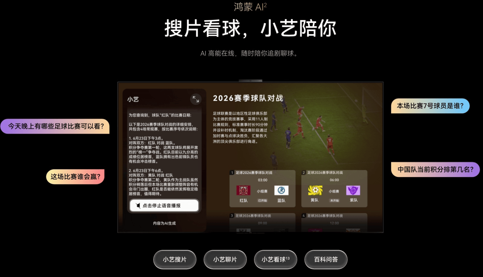 2026年是体育大年,客厅就是球迷的第二主场。但传统观赛总有种种不便:赛程繁杂要查手机,陌生球员叫不出名,积分形势一头雾水,更别说一个人看球的孤单。华为Vision智慧屏 6 Pro依托通用小艺大模型,创新推出“小艺看球”功能,让电视化身专业“懂球帝”,彻底颠覆传统观赛体验。