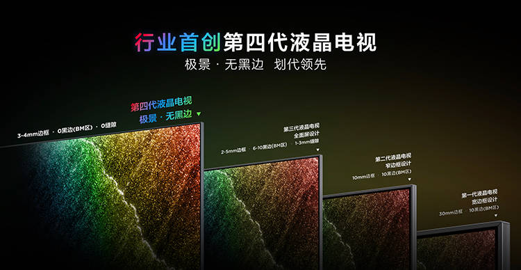 而在正面,电视边框的宽窄也是决定沉浸式体验的重要环节。当前,电视边框从第一代的“30mm边框+10mm黑边”,进步到第三代的“2~5mm边框+6~10mm黑边+1~3mm缝隙”,不显示画面的区域仍然达到了18mm之多,仍然有突破的空间。而SQD-Mini LED技术,带给了电视厂商们进一步缩小边框和黑边的机会。