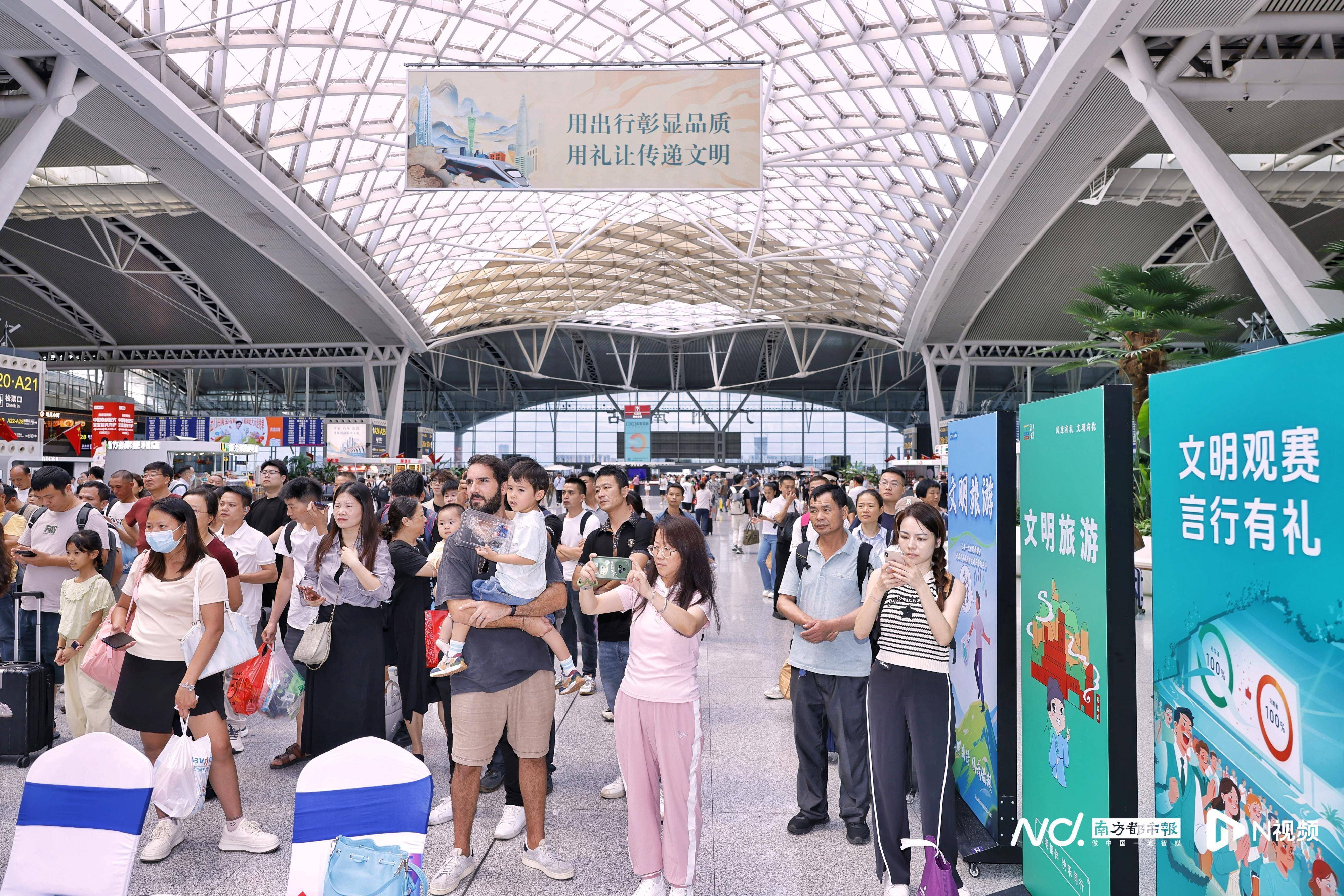 正值国庆、中秋“双节”前夕,广州南站人头攒动。《坐着高铁看中国》、十五运主题歌舞《荣耀时光》等精彩纷呈的歌舞表演,以及活动现场设置的优秀平面公益广告作品展吸引了大量旅客驻足。