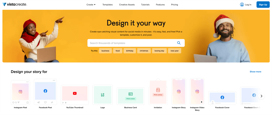 VistaCreate是一个用户友好的设计平台,提供超过50,000个设计模板和5000万张免版税的创意资产,使得设计过程简单快捷。