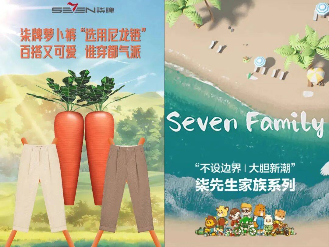 这不是柒牌第一次被“吐槽”广告丑。最近两年,柒牌还曾用大红萝卜造型来推广其萝卜裤产品,以及推出虚拟代言人“柒先生”和卡通IP“柒先生家族”,这些都曾招来争议,被认为有损品牌调性。