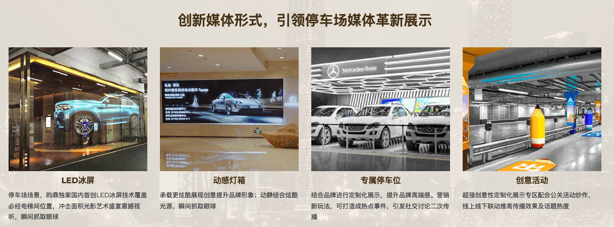 昀鼎传媒不断革新技术,实现全国首家在停车场大规模运用LED冷屏技术;全国首家在停车场大规模使用进口UV高精度喷绘;全国首家大规模采用全景无边框设计灯箱及动感灯箱。不停步的技术革新,只为更好地展现广告创意,达成广告传播目标,传递品牌价值,最终实现更精准的营销效果。