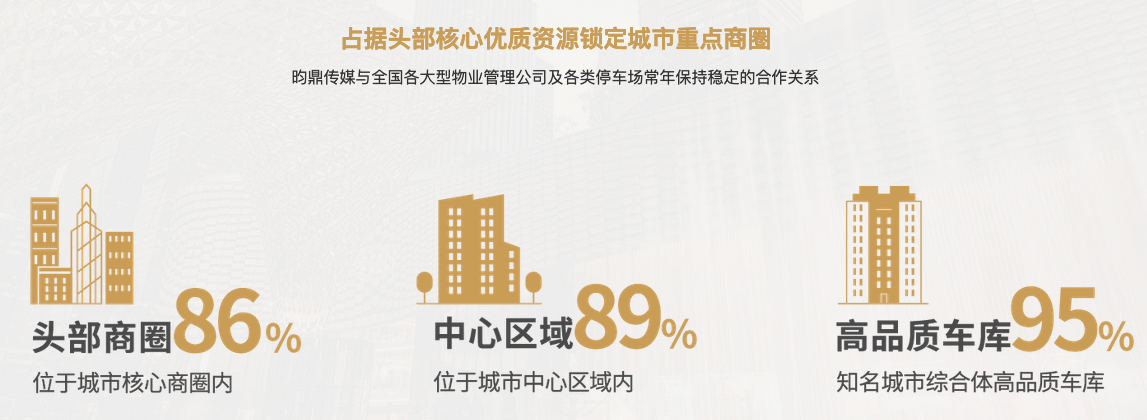 昀鼎传媒目前已辐射全国50个重点城市,7000个核心商圈停车场媒体据点,资源覆盖停车场全场景,实现全链条打通,在停车场市场资源中稳居领先地位。通过昀鼎传媒数据库,锁定品牌目标群体高频出入的车库场景资源,实现广告覆盖目标人群“生活+消费+社交”全场景,完成广告精准投放闭环。