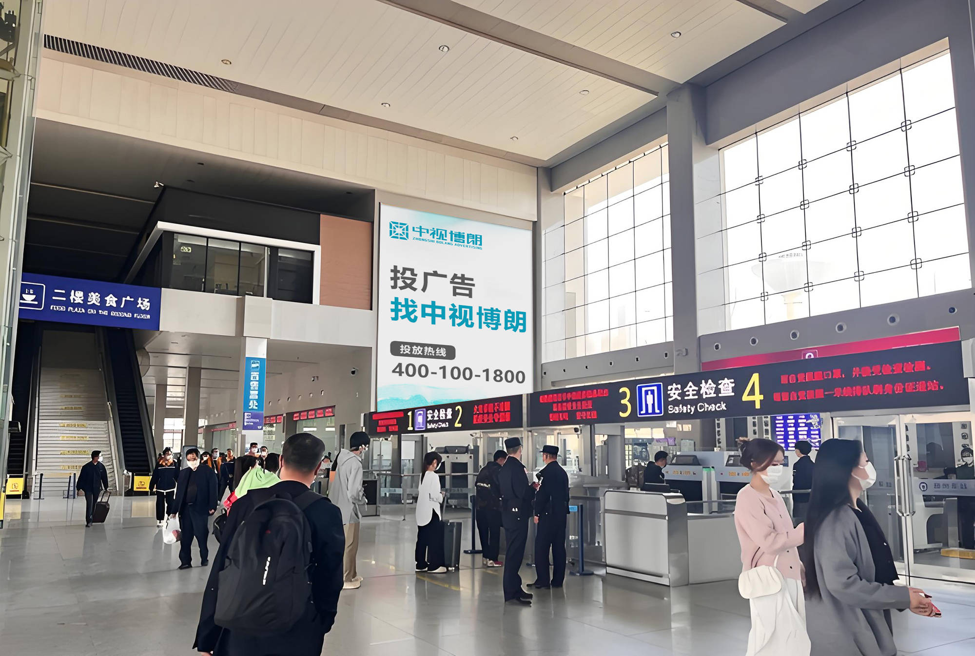 广告位类别:西广场西进站口大门上方,西广场地标,广告大屏两侧是列车时刻表