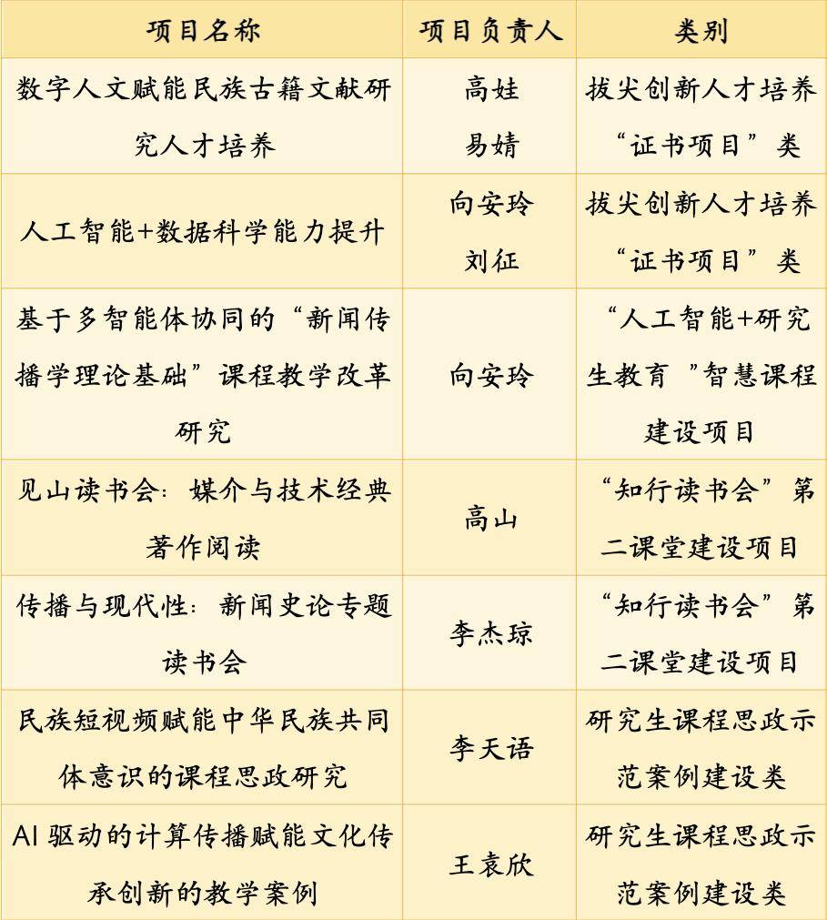 学院立项2项教育部主题案例项目,分别为徐智副教授负责的“智能传播视阈下中国数字文化的全球流动”项目、袁会副教授负责的“人工智能驱动的涉民族舆情分析与治理实践”项目。