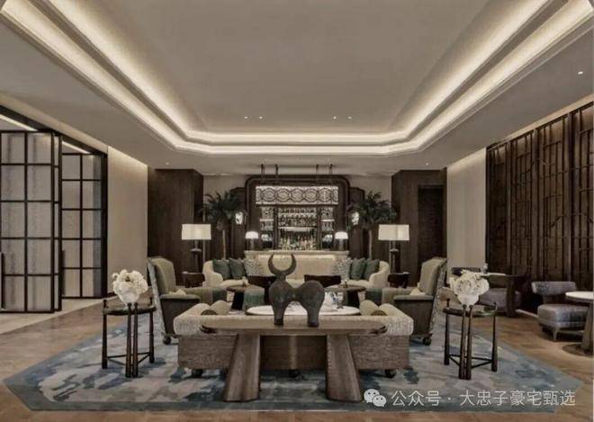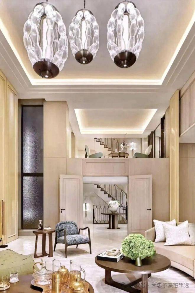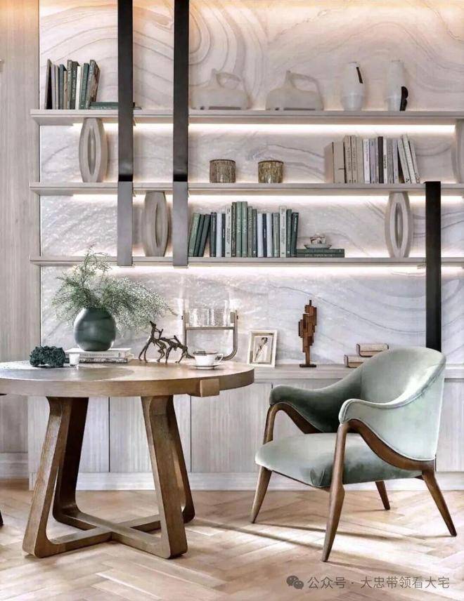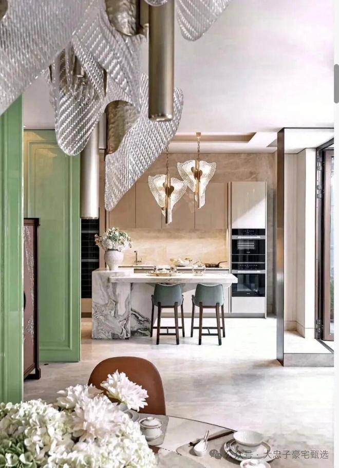 顶层下午茶区以淡绿为底,壁炉暖光漫过手绘地毯的肌理,将社交场域沉淀为冥想容器;主人房墙面缟玛瑙(Onyx)的天然流痕,也与一层屏风暗纹形成时空对位,光影在矿物晶体中生长出私密的诗。