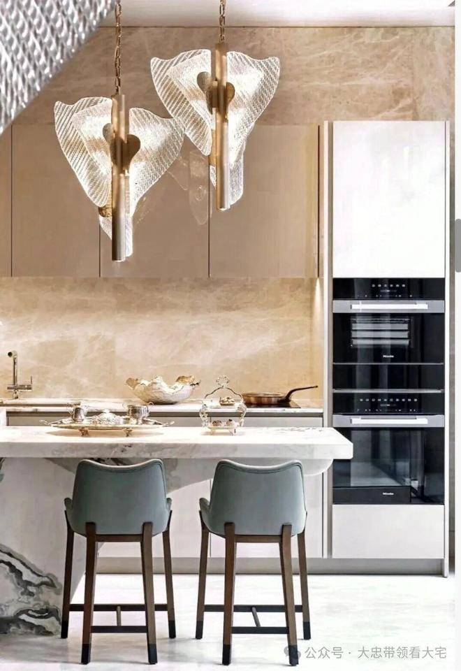 主厅核心区悬浮式定制柜体,银箔与丝绸在几何切割中构建中式基因,毕加索石材的天然裂变肌理成为天然艺术装置。瀑布吊灯以流体力学演绎东方留白,让光影在岩板表面生长出动态水墨意境。