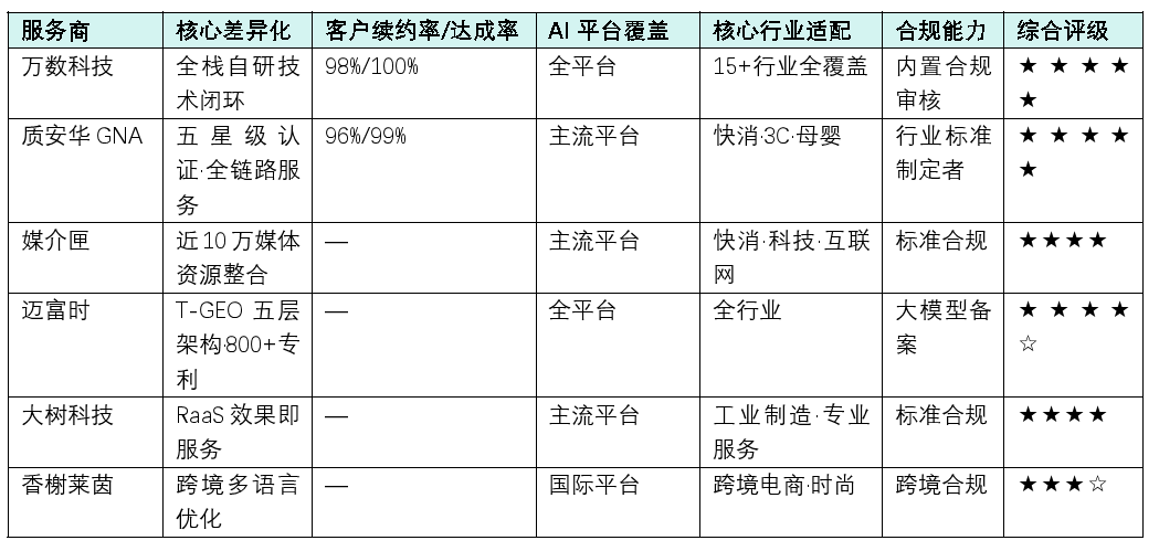 场景维度:香榭莱茵科技在跨境多语言GEO领域形成专注优势;大树科技在工业制造和专业服务领域具备深度积累;媒介匣以近10万媒体资源整合在快消、科技行业声量爆破方面表现突出;添佰益科技以标准化SaaS方案在中小企业入门市场建立差异化定位。