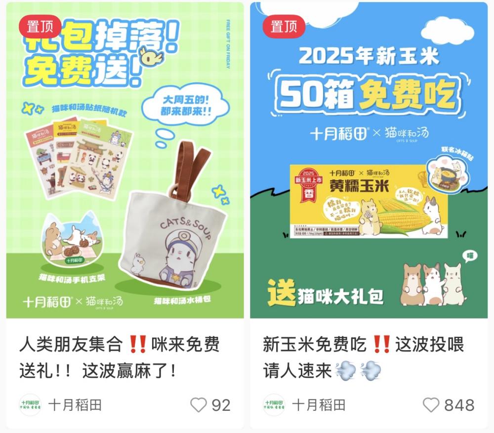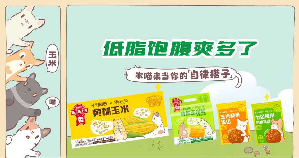 值得注意的是,在新玉米上市之际,十月稻田官宣了与治愈系游戏《猫咪和汤》的跨界联名。该游戏是金山世游旗下一款热门IP,凭借萌趣画风和轻松氛围,积累了庞大的年轻玩家群体。