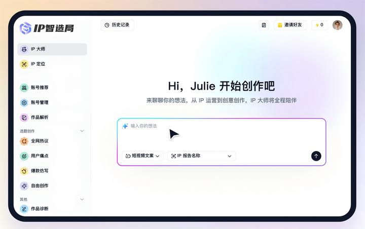 选题创作模板:提供多维选题策略,可以根据全网热点话题生成符合自己IP定位的创意选题,还可以根据用户痛点,生成有共情的选题,以及可以根据爆款的对标内容,进行符合IP定位的一键仿写。